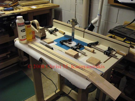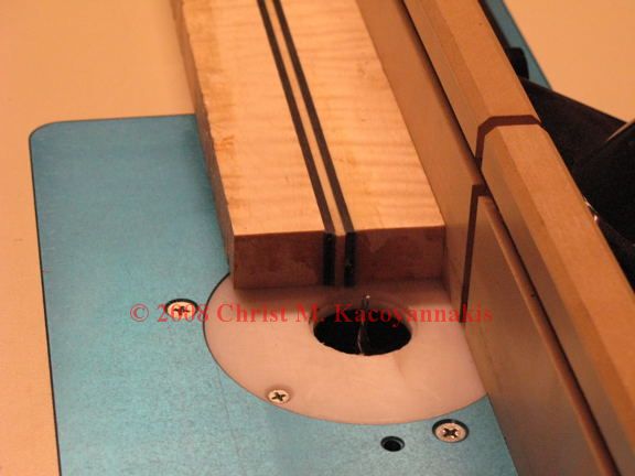 Lay the neck assembly top down on a router table, and route cavities for the carbon fiber neck reinforcement bars.