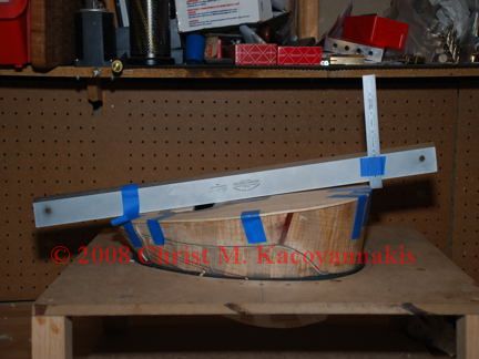 Temporarily attach the top to the body with masking tape. Then lay a straight edge on the top so that it rests on the top at the head block and runs to the point of the bridge’s location. Because of the arch in the braces, the straight edge will rise up above the tail block of the instrument. Measure the distance from the tail block to the bottom of the straight edge.