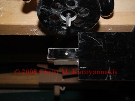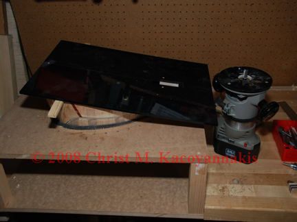 The mortice in the head block is cut at an angle to provide the correct neck set angle. The correct neck set angle allows the plane of the top of the neck to match the angle of the top from the neck joint to the bridge location. Using a specially designed router morticing jig, which matches the tenoning jig used above, the correct angle is set by shimming the end of the jig above the tailblock to match the measurement taken in the first step.