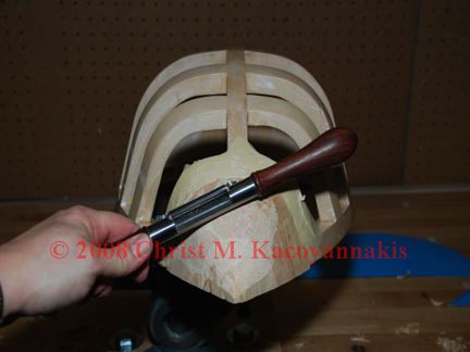 Attached the Basswood headblock to the form with two wood screws. Carving is done with a drawknife and spokeshave, and the headblock is finished with files and sandpaper. I also install a tailblock into the form, also made of Basswood. Many makers make the body first, and then install the tailblock after the body is completed.