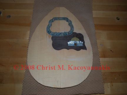 Using a small jeweler’s router with a base, route out the cavities for the rosette and pickguard, after tracing the outline of the inlay onto the soundboard. Glue the rosette and pickguard in place with epoxy or Cyanoacrylate glue. After the glue dries, sand the rosette and pickguard flush with the top. If you are going to put inlays into the pickguard, cut them out and route cavities for them, just like you did for the pickguard.