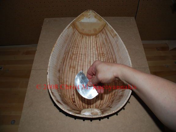 Before putting the body aside to work on other aspects of the bouzouki, it is a good idea to sand the inside. Apply several strips of strong tape to the outside to support the staves. Using a cabinet scraper that has been ground to a semicirclular profile, scape the inside of the body so that the seams between the staves are smooth. Then sand the inside of the body with a rounded block and sandpaper, or a sanding disk on a round, firm foam pad attached to a flexible shaft drill press attachment. The goal is to get the inside smooth, because uneven joints will break up the sound waves produced by the vibrations of the soundboard. In a bouzouki, the body is more of a reflector, reflecting the sound waves produced by the soundboard back at the soundboard and out the soundhole (although on a well made bouzouki the body will vibrate, it just doesn’t really produce much sound in and of itself). In a guitar, or other flat backed, instrument, the back and sides are more like resonating plates, which vibrate sympathetically to the top. Be careful that any staves which were glued in with their edges not meeting perfectly do not get too thin between the scraping and sanding of the outside and inside. It is better to leave a joint a little uneven on the inside, than to risk sanding the wood so thin that it cracks or worse yet, part of the stave is totally sanded away. With practice and the experience of building a few instruments, you will get better at making the staves.